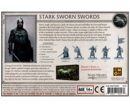 The A Song of Ice and Fire: Tabletop Miniatures Game Stark Sworn Swords unit box contains 12 miniature Sworn Sword figures, one Sworn Sword Captain figure, one Sworn Sword Unit Attachment, a Movement Tray, and all associated Unit cards. These warriors have waited in the frozen North too long, dreaming of battle. They may not be the best equipped units in the war, but they know that shiny armor and pretty swords alone do not a soldier make.