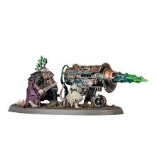 A Warp-Grinder is an arcane reality-boring machine. Manoeuvred by straining thralls and operated by Warlocks who have taken their obsession with undermining their foes to terrifying extremes, these bulky constructs project powerful – if erratic – blasts of energy to open gnawholes, and tunnel into vulnerable regions of a battlefield to allow screeching warrior swarms to set upon enemies from quarters unforeseen.